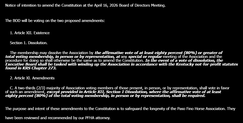 On its face, this is being presented exactly as intended. A safeguard. A way to protect the longevity of the Paso Fino Horse Association. It has been reviewed and recommended by legal counsel, which suggests careful thought and foresight behind the proposal.